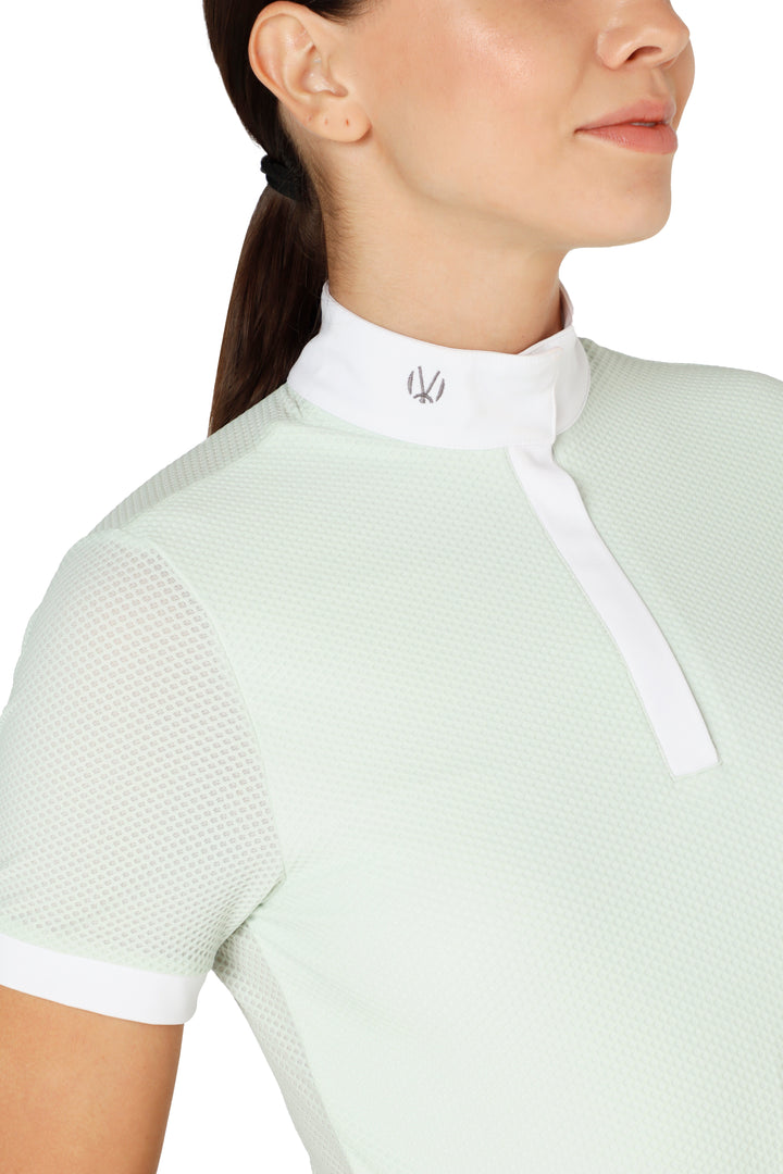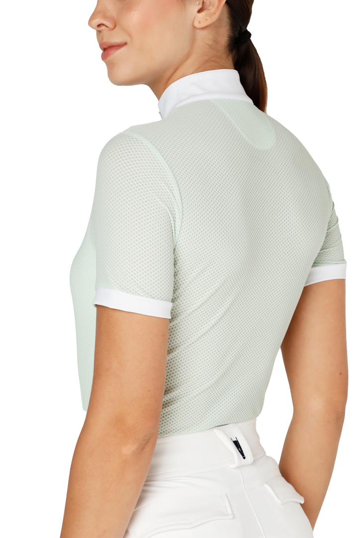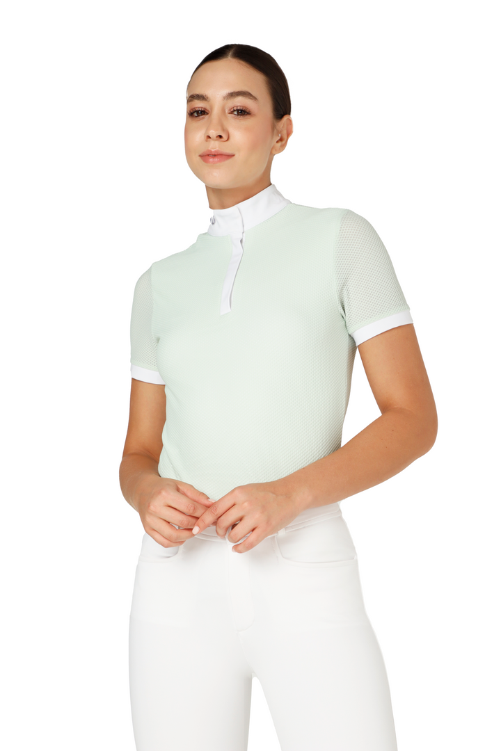 Camiseta manga corta de cuello alto, elaborada en tela con alta tecnología que proporciona flexibilidad, comodidad y protección al jinete durante los entrenamientos.