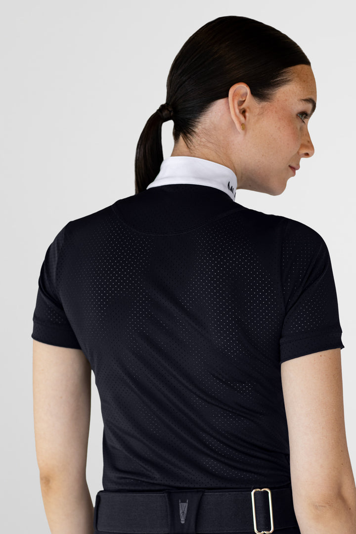 Camiseta manga corta de cuello alto, elaborada en tela con alta tecnología que proporciona flexibilidad, comodidad y protección al jinete durante los entrenamientos.
