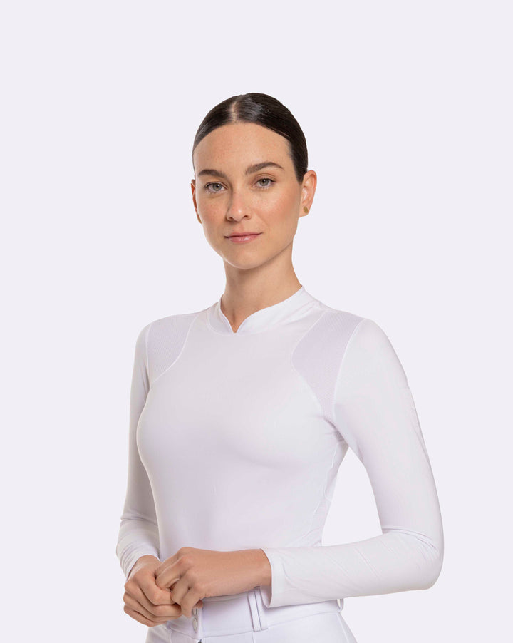 Camiseta manga larga de cuello alto y bloques , elaborada en telas con alta tecnología que proveen flexibilidad, confort y protección al jinete durante los entrenamientos.