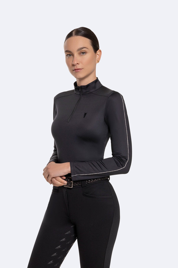Camiseta manga larga de cuello alto , elaborada en tela con alta tecnología que provee flexibilidad, confort y protección al jinete durante los entrenamientos, mezclando la elementos deportivos y sutiles toques de brillo.