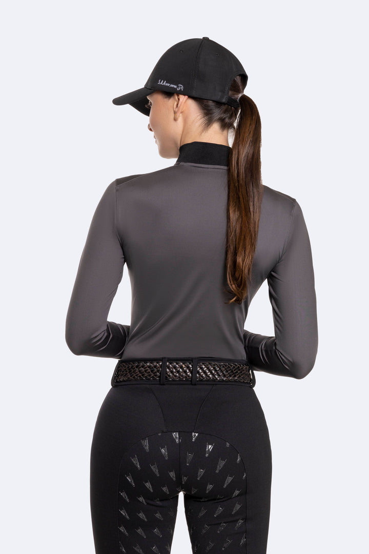 Camiseta manga larga de cuello alto, elaborada en tela con alta tecnología que provee flexibilidad, confort y protección al jinete durante los entrenamientos.
